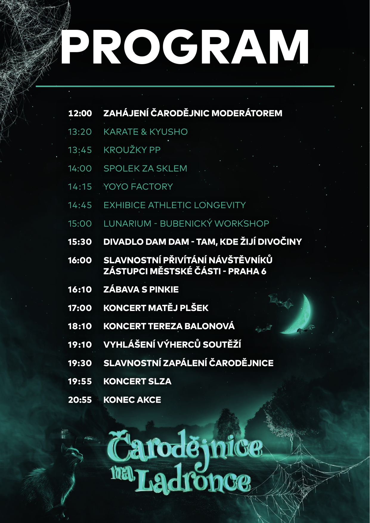 Čarodějnice na Ladronce všem návštěvníkům vykouzlí úsměv na tváři díky bohatému hudebnímu programu na podiu s koncerty známých kapel, zábavným soutěžím i sportovním a jiným doprovodným aktivitám. Těšte se také na gastronomické pochoutky.
